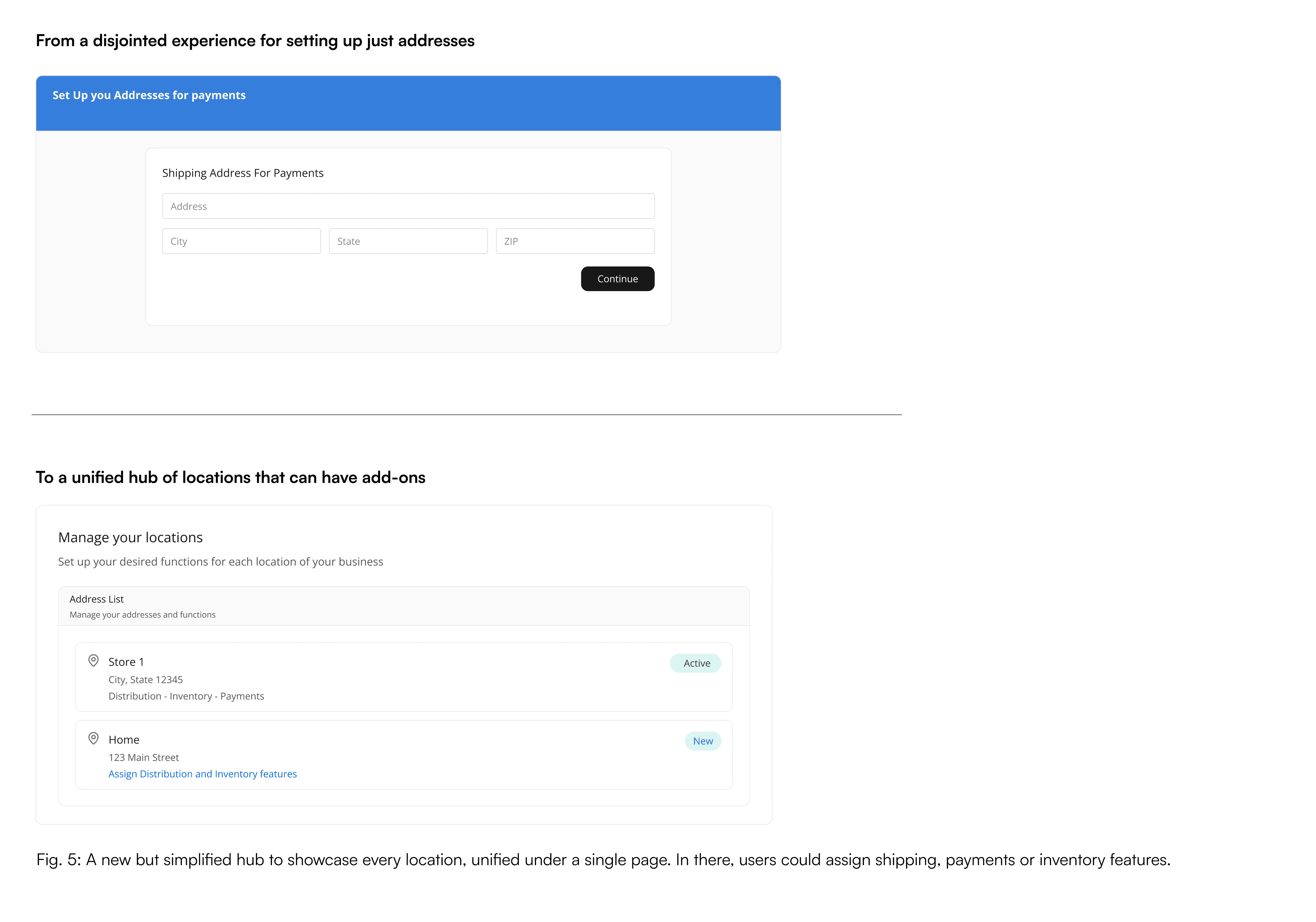 The core product itself was deliberately minimal: a location dashboard showing each physical location and which services (shipping, payments, inventory sync) had been activated.
